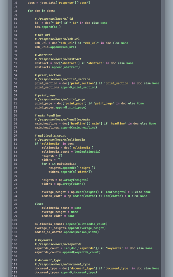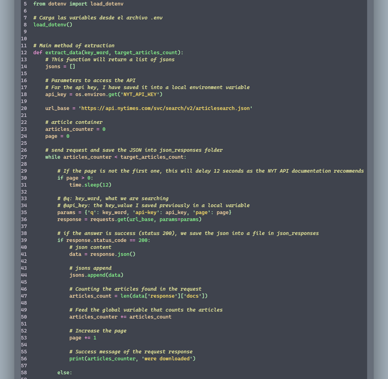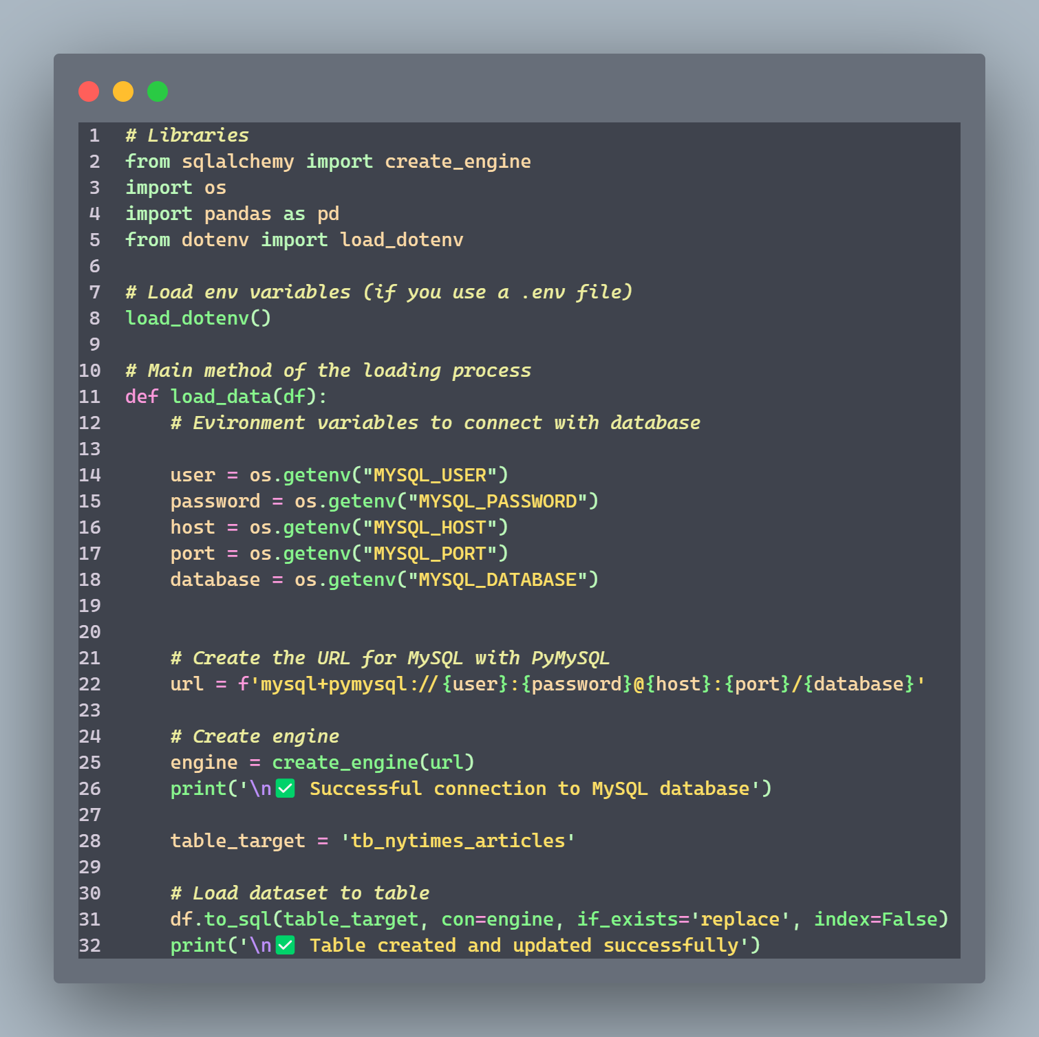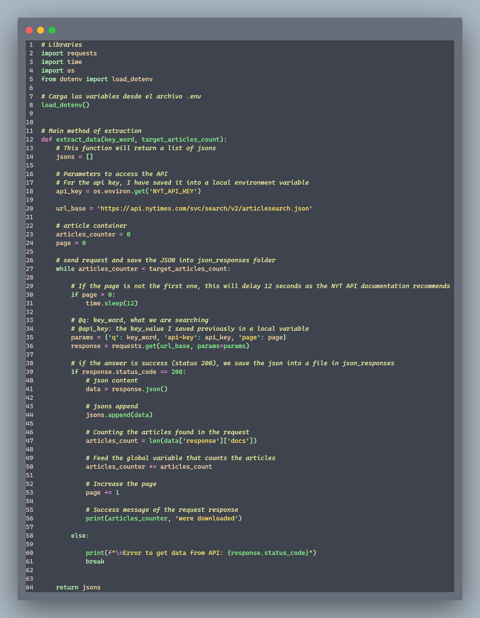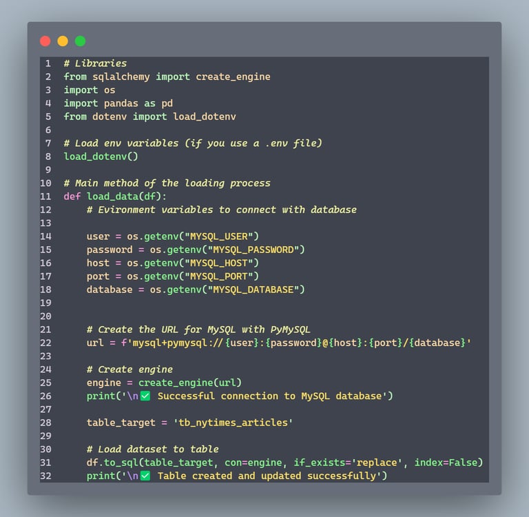 This project implements an ETL (Extract, Transform, Load) process using Python to extract data from the New York Times API. The system collects news articles and performs processing to transform the information into a structured format suitable for analysis and storage in a database. The project encompasses the automation of data extraction, data cleansing and transformation, and final loading into an efficient storage system in a MySQL DataBase.